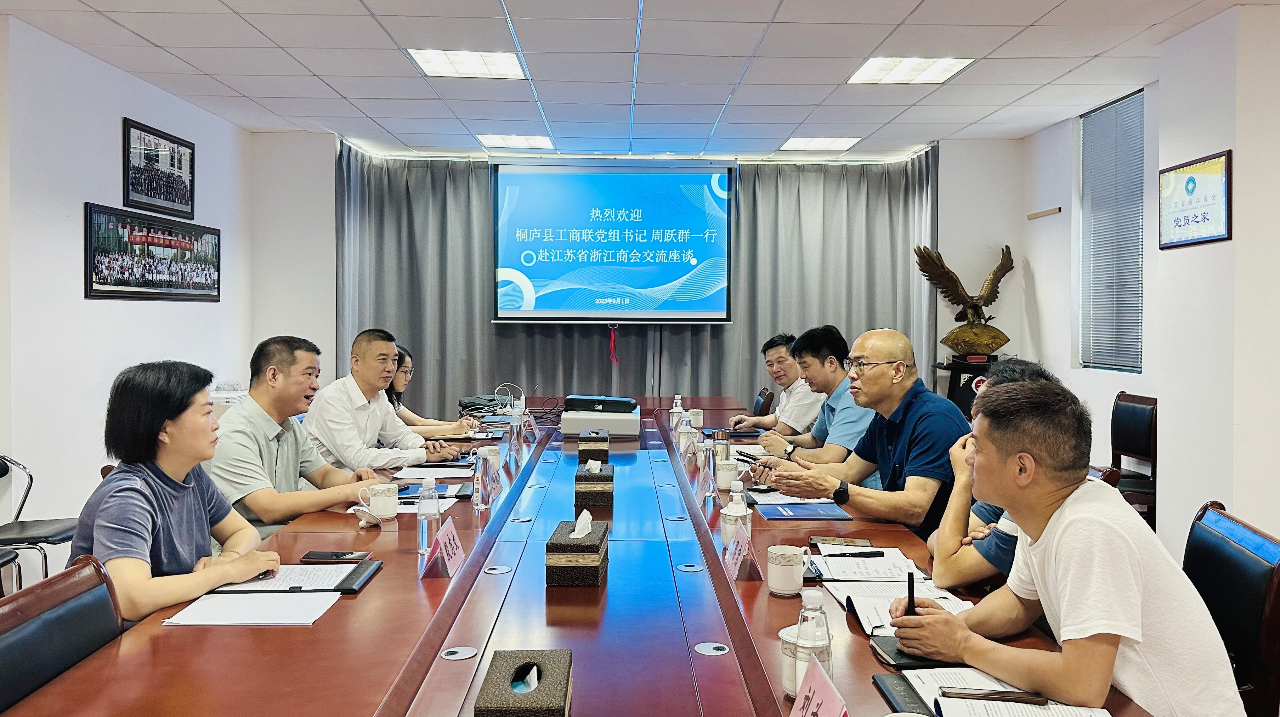 赵峥涞常务副会长向周书记一行介绍了近年来 的建设情况和浙商在江苏的发展概况,重点分享了商会在规范办会、联盟建设、人才交流、资源对接等方面的创新做法。赵会长指出, 作为苏浙两省经济合作交流的桥梁、引领在苏浙商团结发展的平台,将进一步加强与家乡政府部门的沟通与联系,充分发挥政府赋予商会组织的社会职能,积极推荐在苏浙江籍企业家以及各行各业优秀人才赴桐庐发展,将浙商紧密抱团的特质与桐庐独特优秀的地理位置相融合,努力引导和促进浙商回归,为家乡的经济社会建设贡献更多力量。